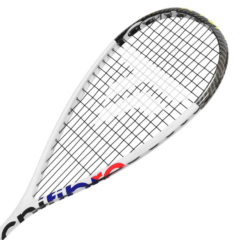 Absolutely iconic, the Carboflex 125 X-TOP racket is one of the most common models on the Tour as it's used by the world's best players like Mohamed El Shorbagy. Top in performance, it's perfect for amateur and competitive players looking for the best combination of power and spin. Extremely light (125 g) for easy maneuverability and quick play. Maximum power with 500 cm² head size and Dynamix V.P. multifilament strings, it's the most powerful in the Tecnifibre line. The racket shape was redesigned by the "Airshaft" section for better aerodynamics and head acceleration. The single shaft is reinforced on the two sides with "X-Arms" tendons to limit racket flexibility and provide stability and precision on impact. To increase spin and tolerance against off-centre shots, the Carboflex 125 X-TOP features "Extended String hole" technology: 12 eyelets at specific spots on the frame (at 3, 9 and 12 o'clock) have been enlarged to let the strings breathe and enhance their elasticity.