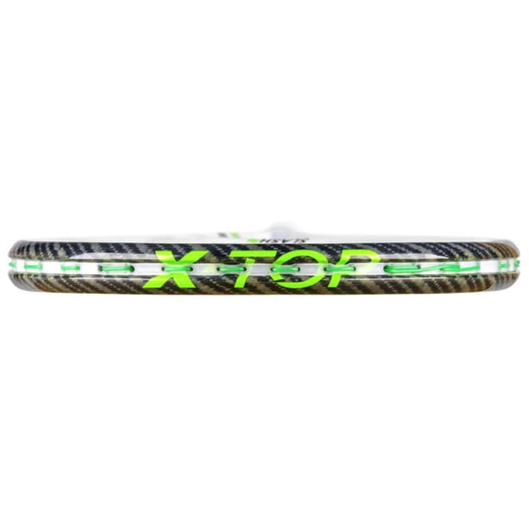 The X-TOP revolution is also built in to the product. No bumper, 100% performance. A completely new racket head construction where the bumper has been replaced by a combination of active fibres for maximum strength, speed and playability. The plastic bumper has been replaced by a mix of aramid fibres, the most impact-resistant material, and a PTFE treatment to improve slide and protect the frame against abrasion from the floor or walls. Without the bumper, the racquet becomes much smoother and penetrates the air better for maximum swing speed and power. With the plastic replaced by material, there are more fibres in the racquet for greater responsiveness and less vibration for greater comfort.